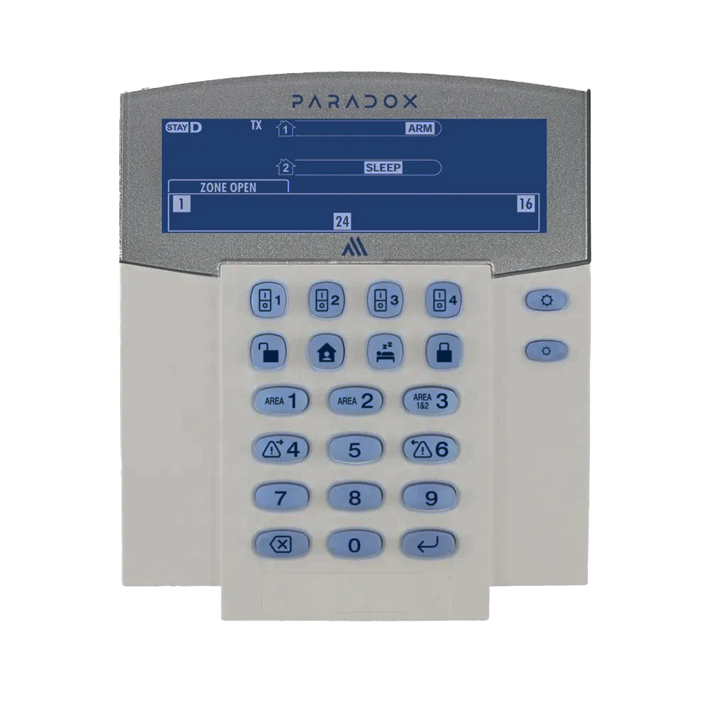 SKU K38M Categories Control de acceso, Teclados inalambricos Tag A Teclado LCD inalámbrico Paradox de 48 zonas, 2 particiones, 4 teclas de activación PGM, Control de pánico, sensor de temperatura. (M25) (Paradox)