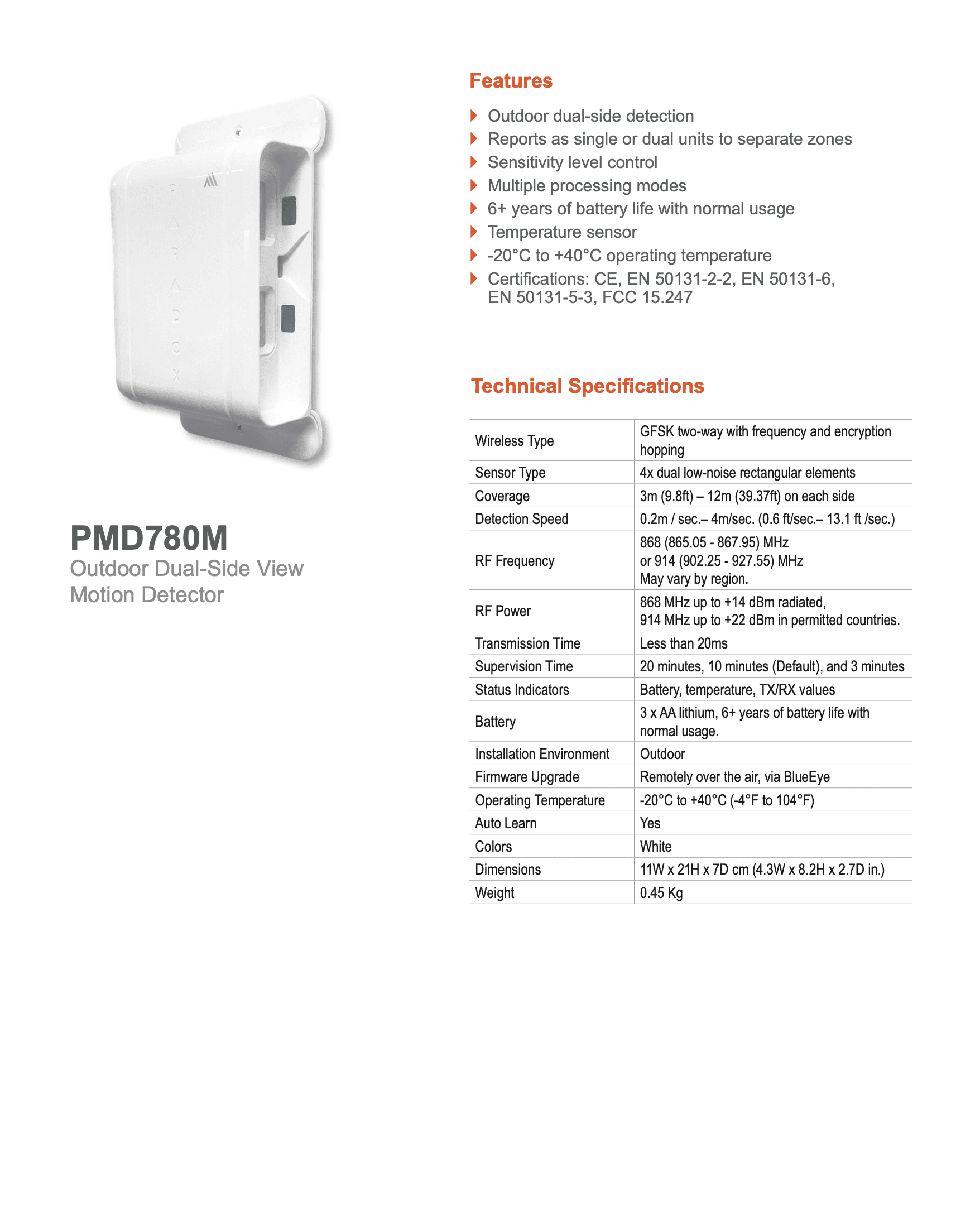 Detector de movimiento, Paradox, (M25), inalámbrico, exterior, detección en ambos lados, para reportar como unidad única o dual, control de nivel de sensibilidad, múltiples modos de procesamiento, sensor de temperatura, PMD780M