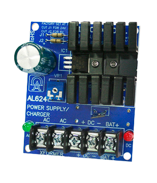 SKU AL624 Category Alimentación Tag A Fuente de poder / cargador modular para alarmas o control de acceso, tablero sin gabinete. Entrada 16-24 VAC, salida seleccionable 6 V, 12 V o 24 V hasta 1.2 A (0.75 A en 24 V). Incluye cargador y protección térmica.